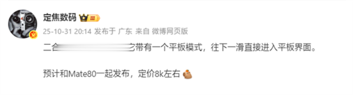 从8000元左右的定价来看,华为新款二合一平板显然瞄准了高端市场,目标用户大概率是对设备便携性、生态协同性、使用体验有高要求的商务人士、创意工作者或华为生态忠实用户。在当前二合一平板市场,既具备强大性能,又能深度融入生态的产品并不多见,华为这款新机若能兑现爆料中的交互与协同优势,或将填补这一市场空白。